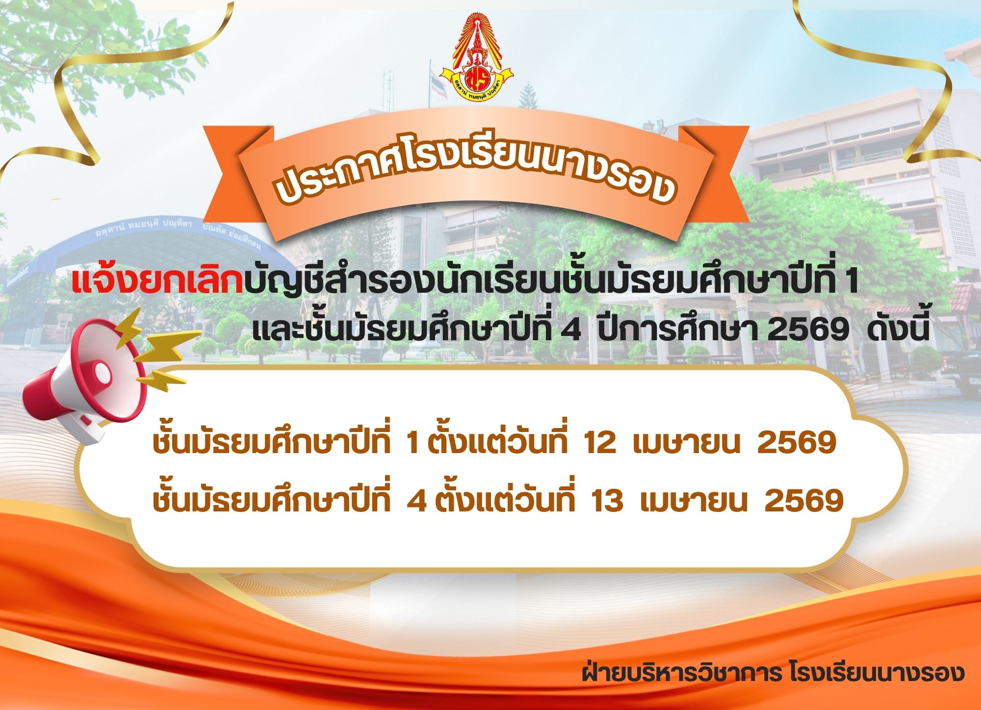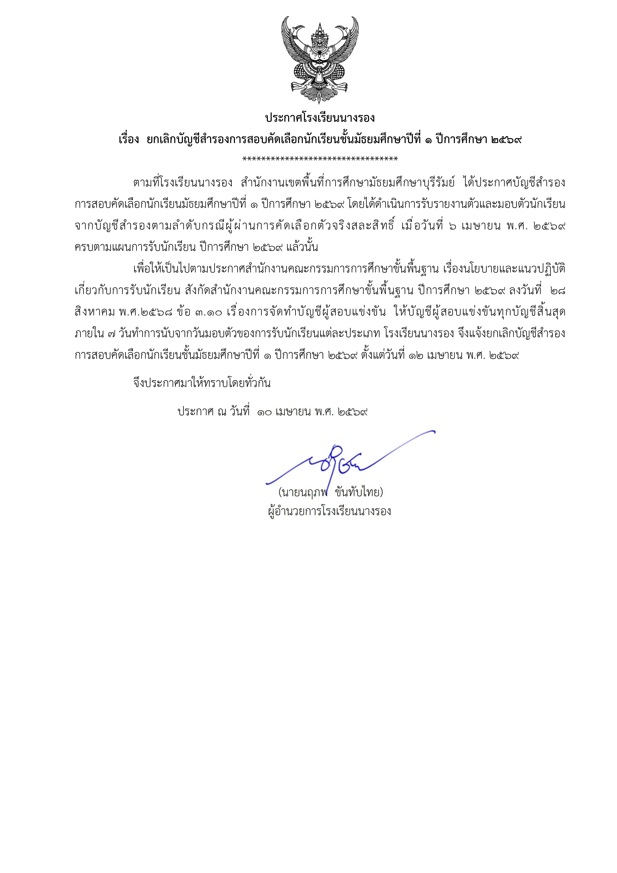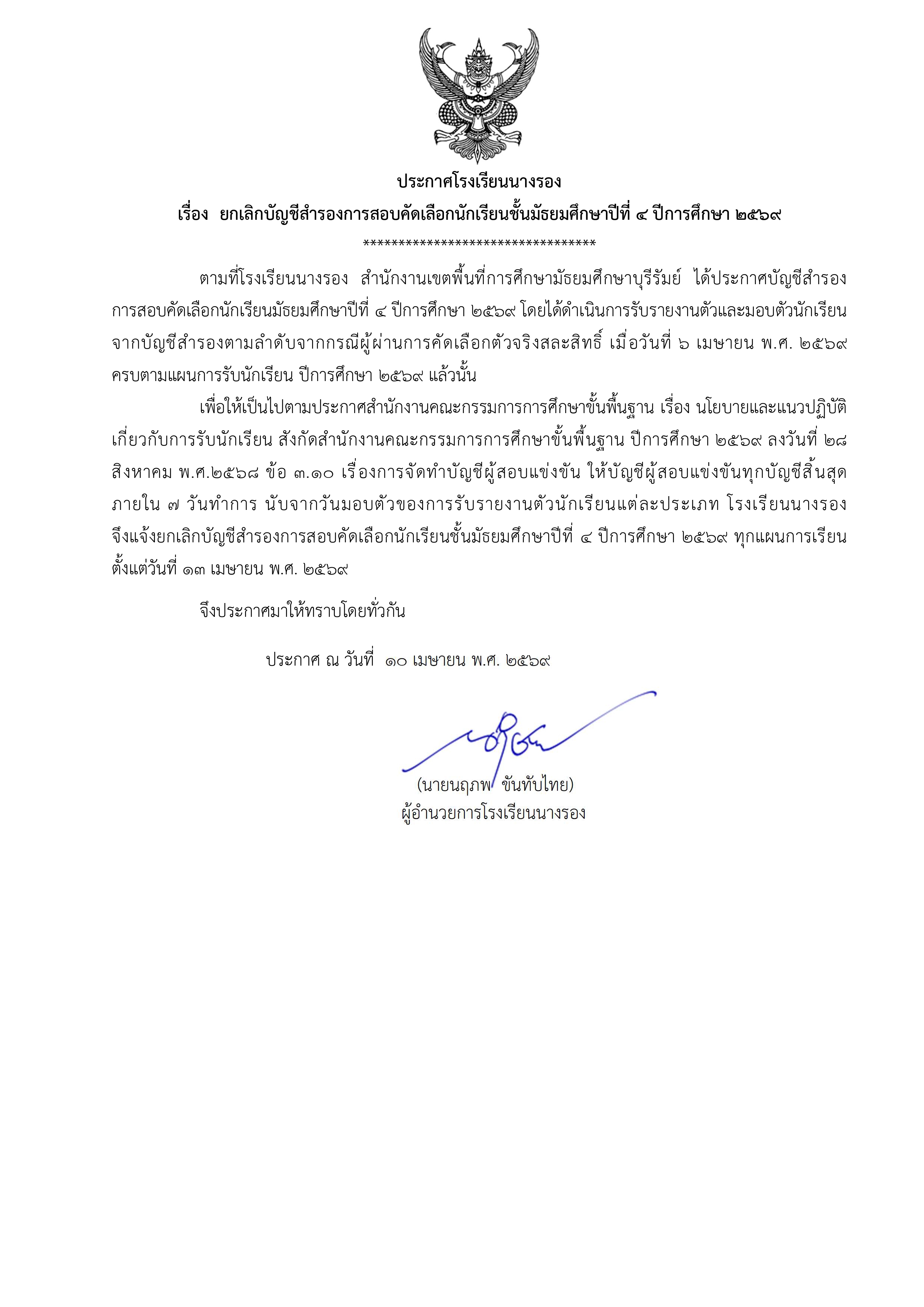 - ประกาศ ยกเลิกบัญชีสำรองการสอบคัดเลือกนักเรียน ปีการศึกษา 2569 (13 เมษายน 2569)